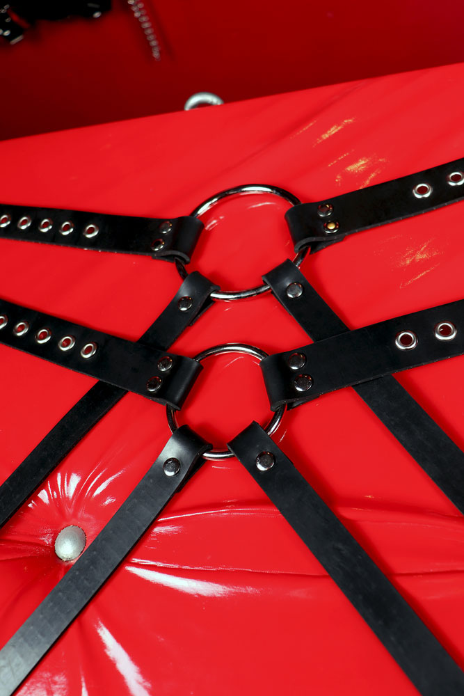 Black rubber strap-on dildo.